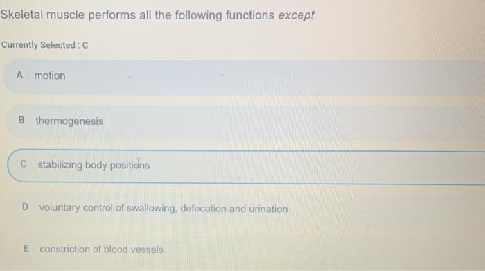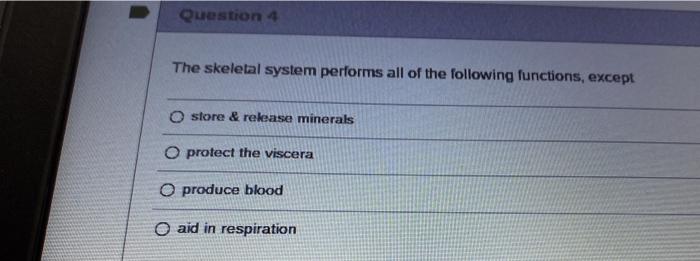 Contraction of the urinary bladder B. The skeletal system is composed of all of the following EXCEPt _____. The skeletal system performs all of the following functions EXCEPT. A supports soft tissues. A communication b control c conduction d integration c 5. Bone marrow produces red and white blood cells which. The skeletal system serves all of the following functions except aiding in the production of hormones that signal muscle and hair growth.