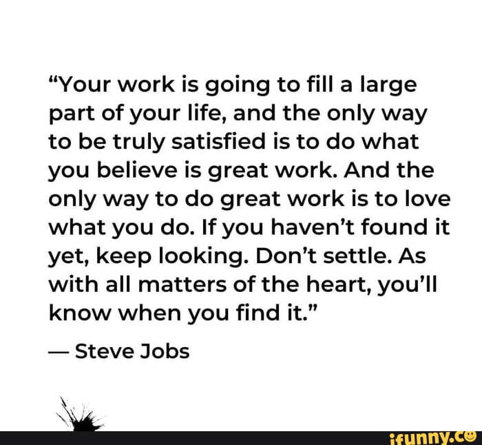 If you havent found it yet keep looking. As with all matters of the heart youll know when you find it 4. If you havent found it yet keep looking. Your work is going to fill a large part of your life and the only way to be truly satisfied is to do what you believe is great work. Your work is going to fill a large part of your life and the only way to be truly satisfied is to do what you believe is great work. Your work is going to fill a large part of your life and the only way to be truly satisfied is to do what you believe is great work. And the only way to do great work is to love what you do. Quote by Steve Jobs and Steve Jobs quotations. And the only way to be truly satisfied is to do what you believe is great work.