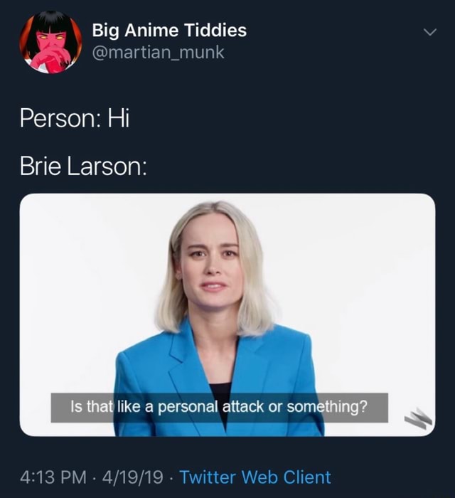 The clip shows Brie Larson using the phrase after being asked a question during the interview and giving a seemingly hostile response. Brie Larson comes off a bit defensive and hostile in the video with her answers coming off as rather condescending. 20 Photos Of Brie Larson We Cant Stop Looking At.